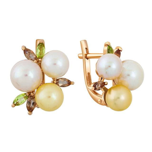 Серьги из красного золота с хризолитами, ситаллами и жемчугом (042221)