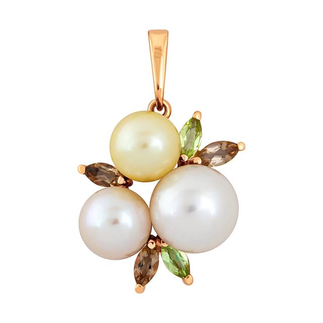 Кулон из красного золота с хризолитами, ситаллитами и жемчугом (042222)