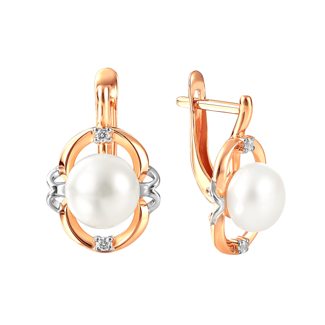 Серьги из красного золота с жемчугом и фианитами (041620)