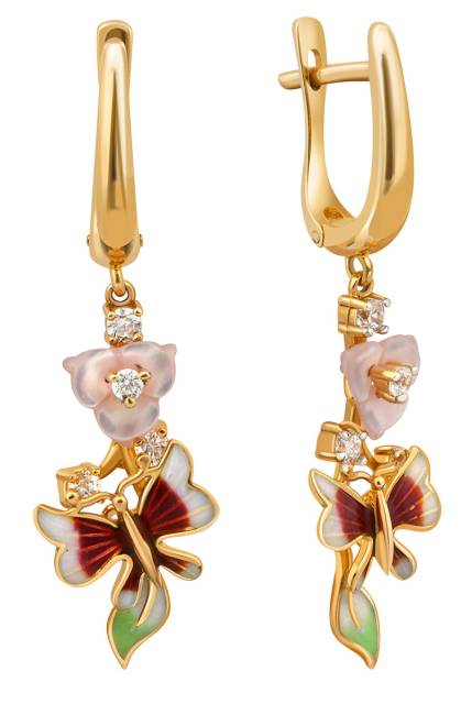 Серьги из жёлтого золота с цирконами, перламутром и эмалью (012112)
