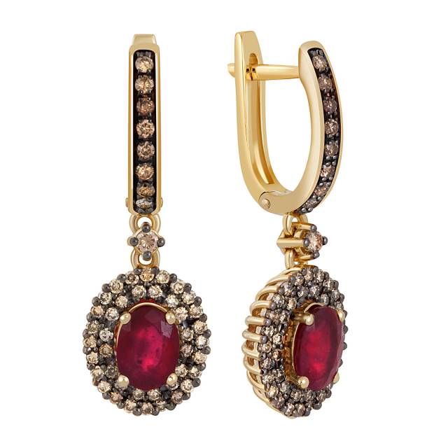 Серьги из жёлтого золота с коньячными бриллиантами и рубинами (046671)