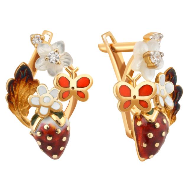Серьги из жёлтого золота с цирконами, перламутром и эмалью (012124)