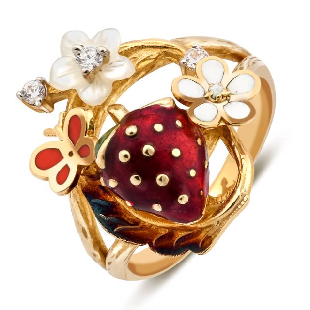 Кольцо из жёлтого золота с цирконами, перламутром и эмалью (012123)