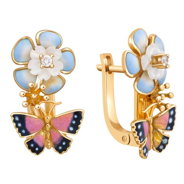 Серьги имз жёлтого золота с цирконами, перламутром и эмалью (023938)