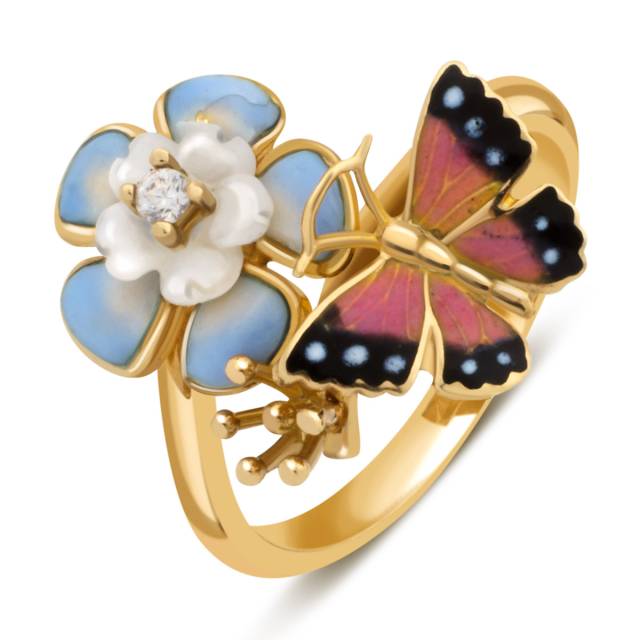 Кольцо из жёлтого золота с цирконом, перламутром и эмалью (022286)
