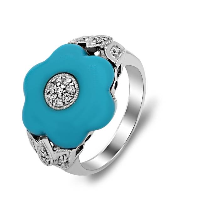 Кольцо из белого золота с бриллиантами и бирюзой (017563)