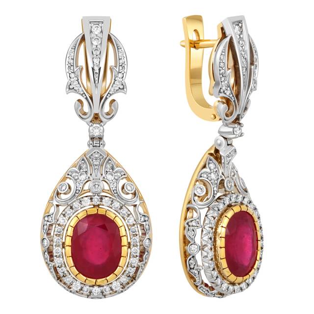 Серьги из комбинированного золота с бриллиантами и рубинами (039872)