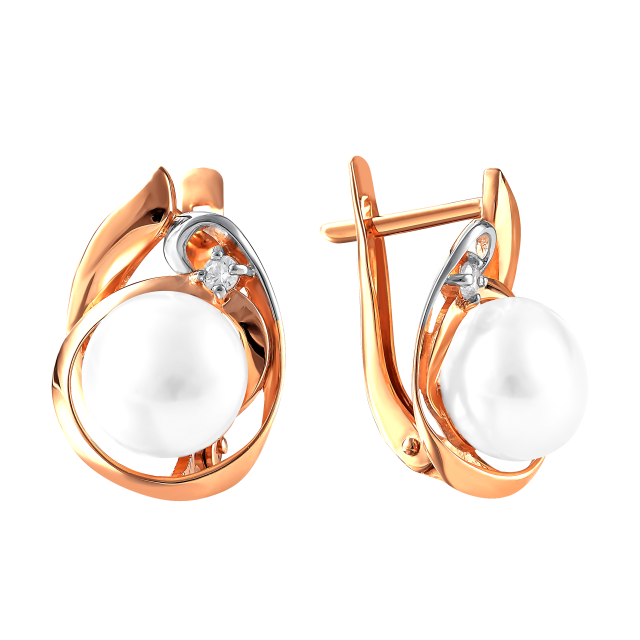 Серьги из красного золота с жемчугом и фианитами (041476)