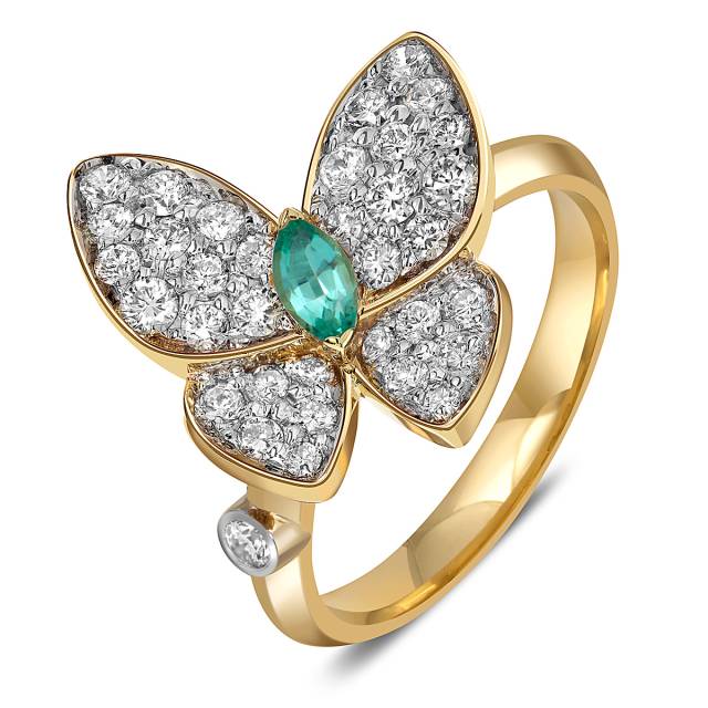 Кольцо из жёлтого золота с бриллиантами и изумрудом "Бабочка" (059984)