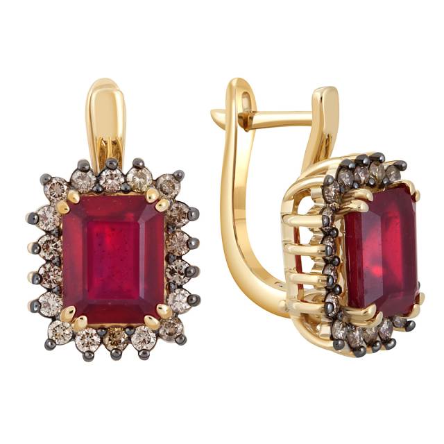 Серьги из жёлтого золота с коричневыми бриллиантами и рубинами (046922)