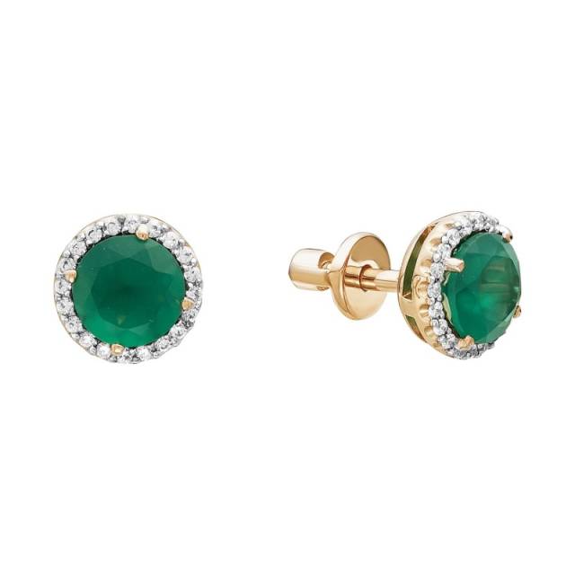 Серьги пусеты из красного золота с бриллиантами и зелёными агатами (039984)