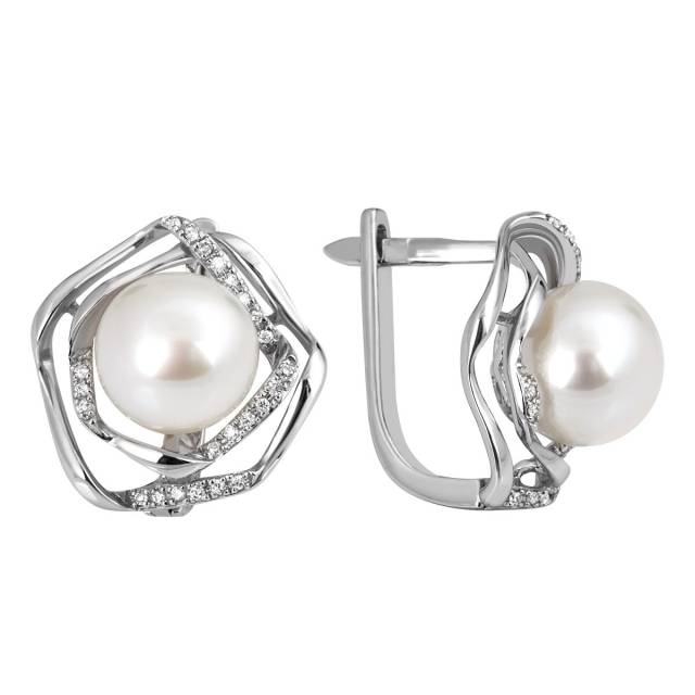 Серьги из белого золота с бриллиантами и белым жемчугом (047204)